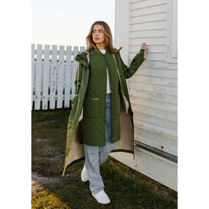 Love this elegantly quilted vest, with a long line silhouette for enhanced coverage. Lightweight pol
