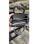 This small handbag has an inside zipper, and a crossbody strap that attaches to the sides.
