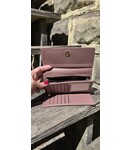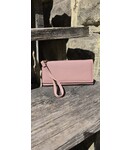 This streamlined and classic wallet/clutch is just the answer with a wrist strap, snap closure, zippered section for change, a billfold, 12 card slots, and a slide in area for receipts.