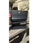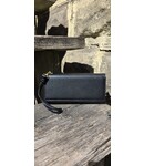 This streamlined and classic wallet/clutch is just the answer with a wrist strap, snap closure, zippered section for change, a billfold, 12 card slots, and a slide in area for receipts.